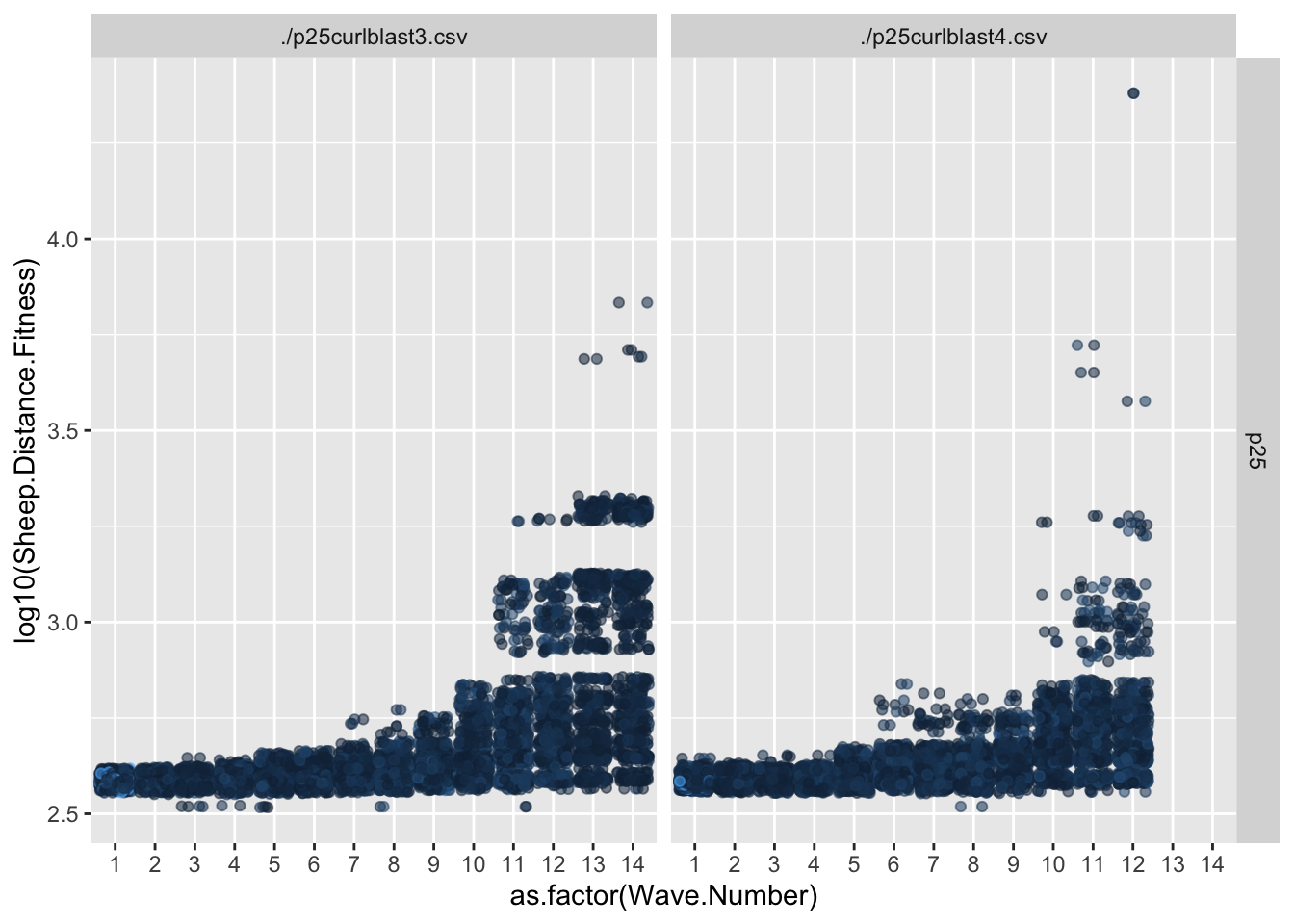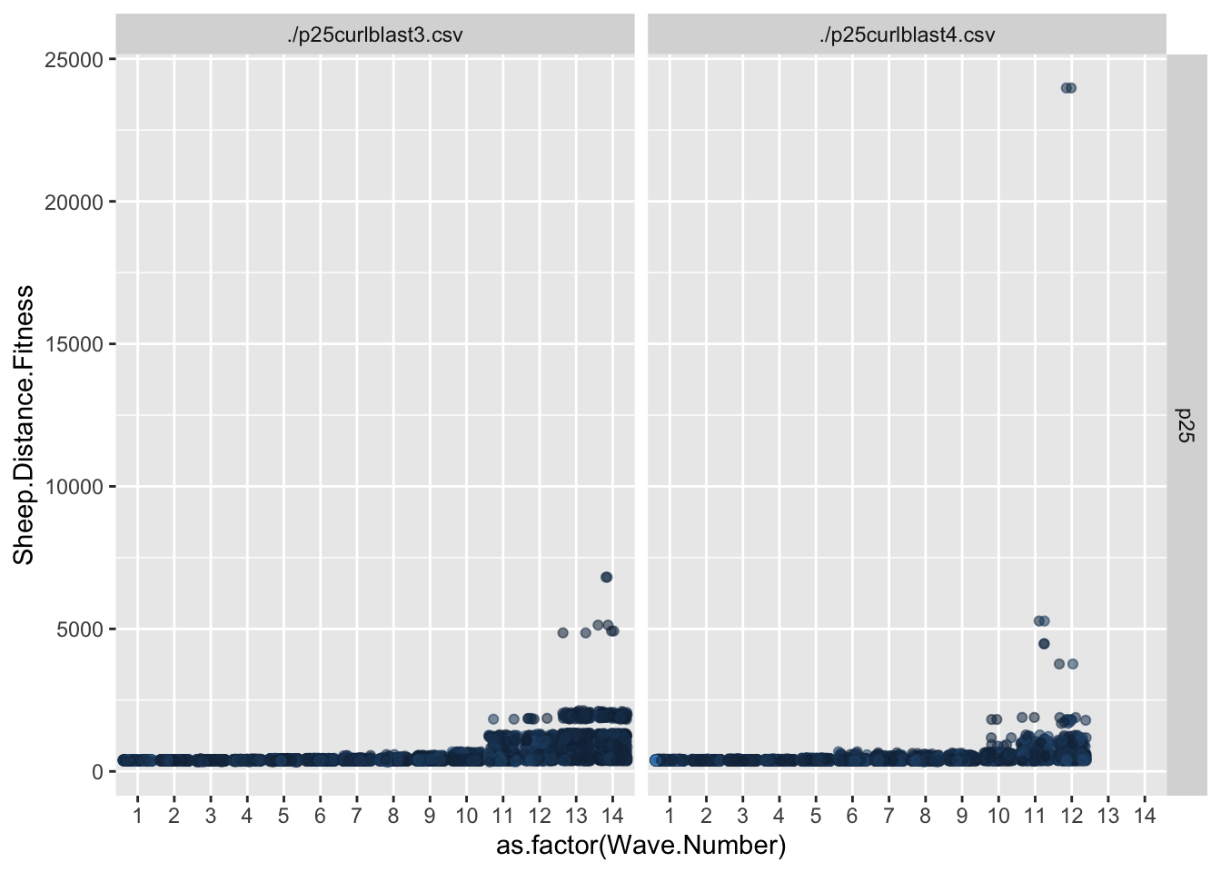 fitness <- ggplot(fit_ranked%>% filter(Wave.Number < max(Wave.Number)), aes(x = Sheep.Distance.Fitness, y = offspring_count))+ geom_point(aes(color = Speed.Trait))+ geom_smooth(method = “lm”)+ facet_grid(Wave.Number~file)