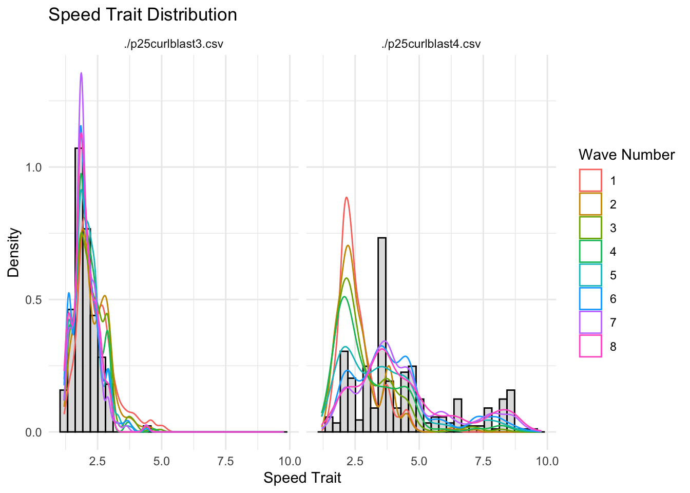 speed <- ggplot(fit_ranked%>% filter(Wave.Number < max(Wave.Number)), aes(x = Speed.Trait, y = offspring_count))+ geom_point(aes(color = Main.Type))+ geom_smooth(method = “lm”)+ facet_grid(Wave.Number~file)