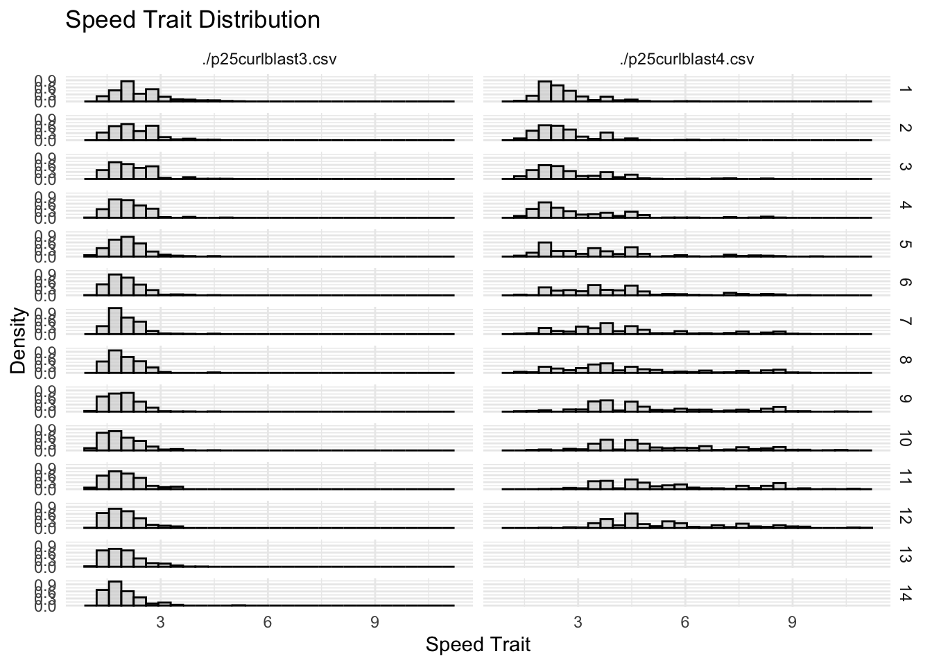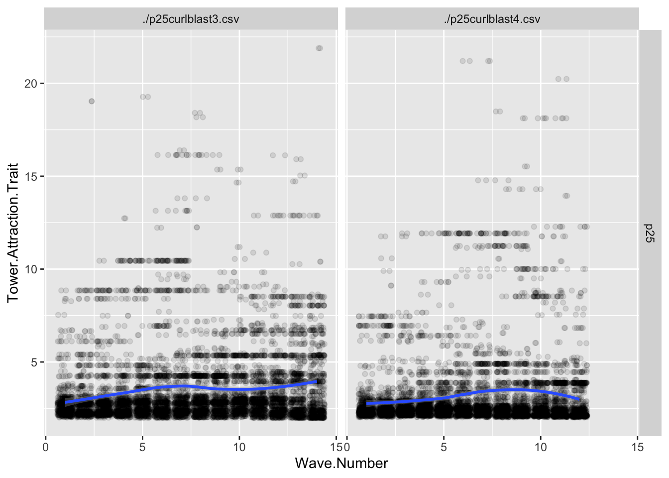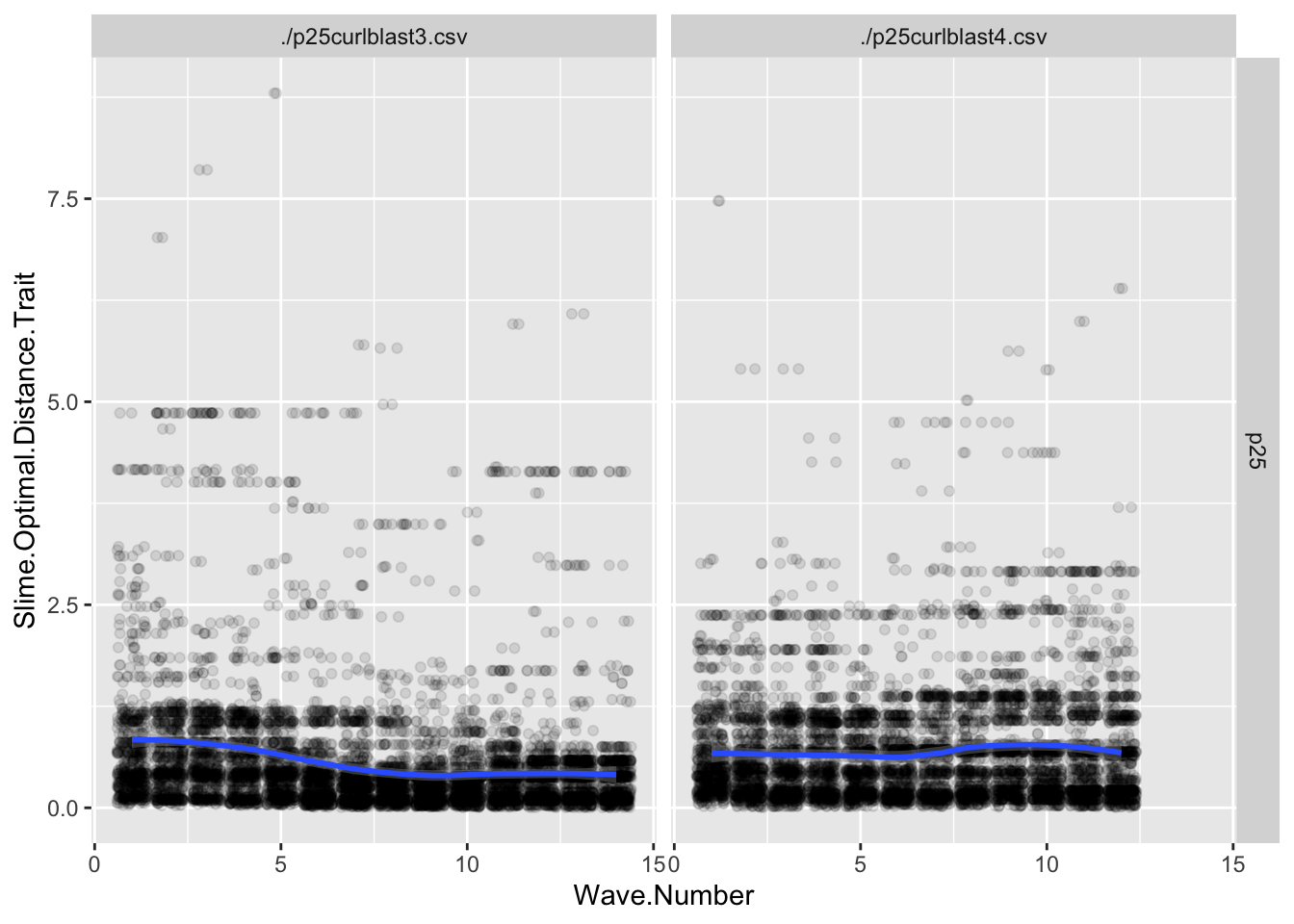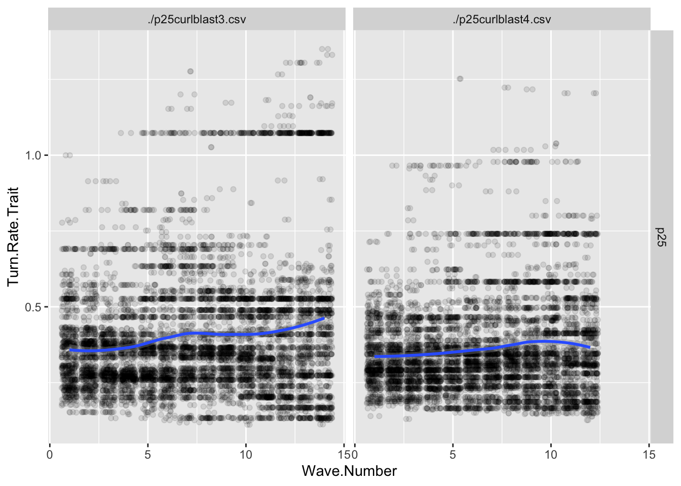 fitnessrank <- ggplot(fit_ranked%>% filter(Wave.Number < max(Wave.Number)), aes(x = fitrank, y = offspring_count))+ geom_point(aes(color = Speed.Trait))+ geom_smooth(method = “lm”)+ facet_grid(Wave.Number~file)